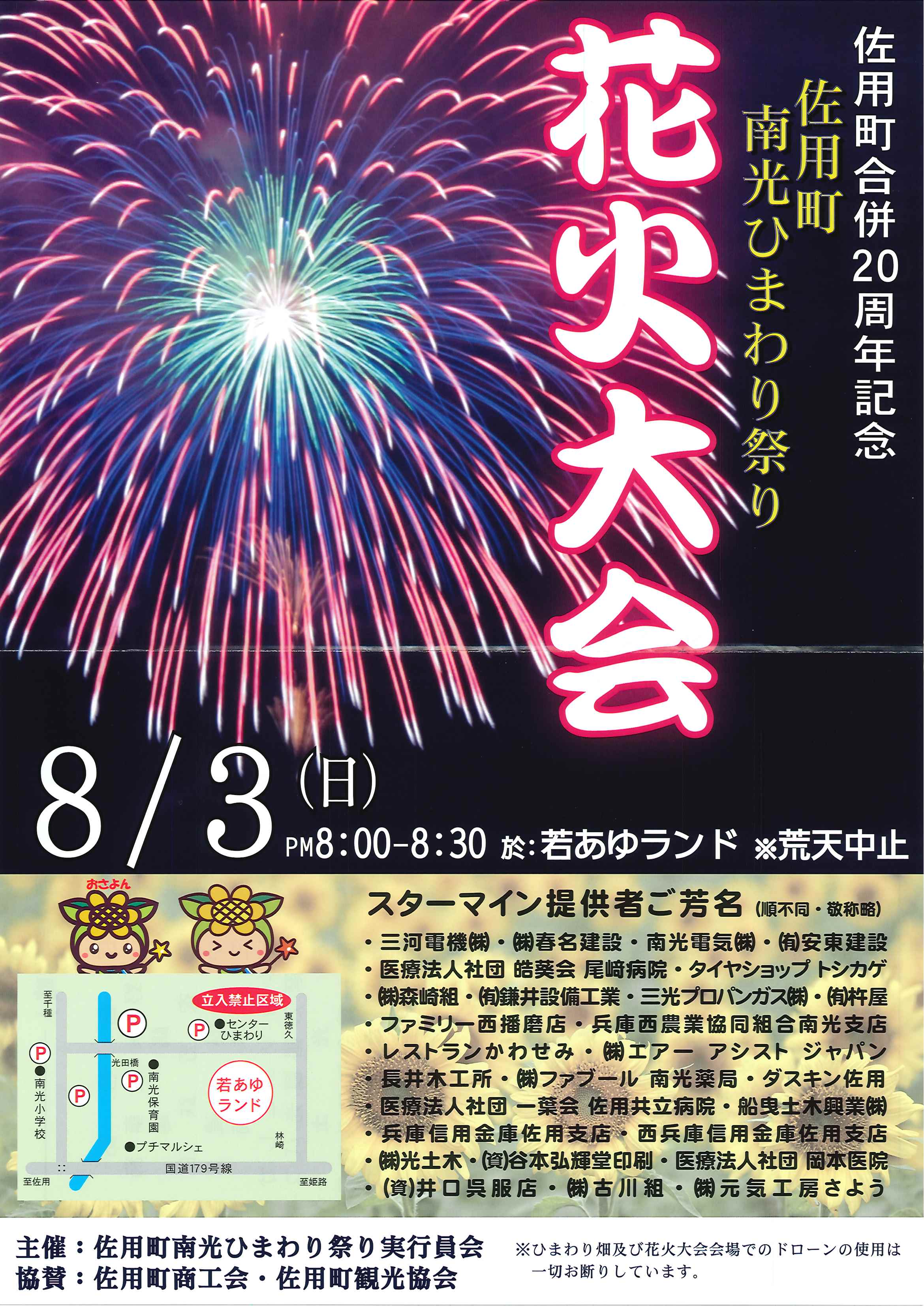 2025.08.04 本イベントは終了しました。多数のご来場ありがとうございました。 2025.07.30掲載 佐用町南光ひまわり祭り花火大会のご案内 ご来場をお待ちしております。 ※ひまわり畑は、8月3日(日)で閉園になります 投票数:170 平均点:10.00 この記事の1行目に飛ぶ 令和5年度夏のイベントのご案内 >イベント一覧 2023さよう納涼夏まつり